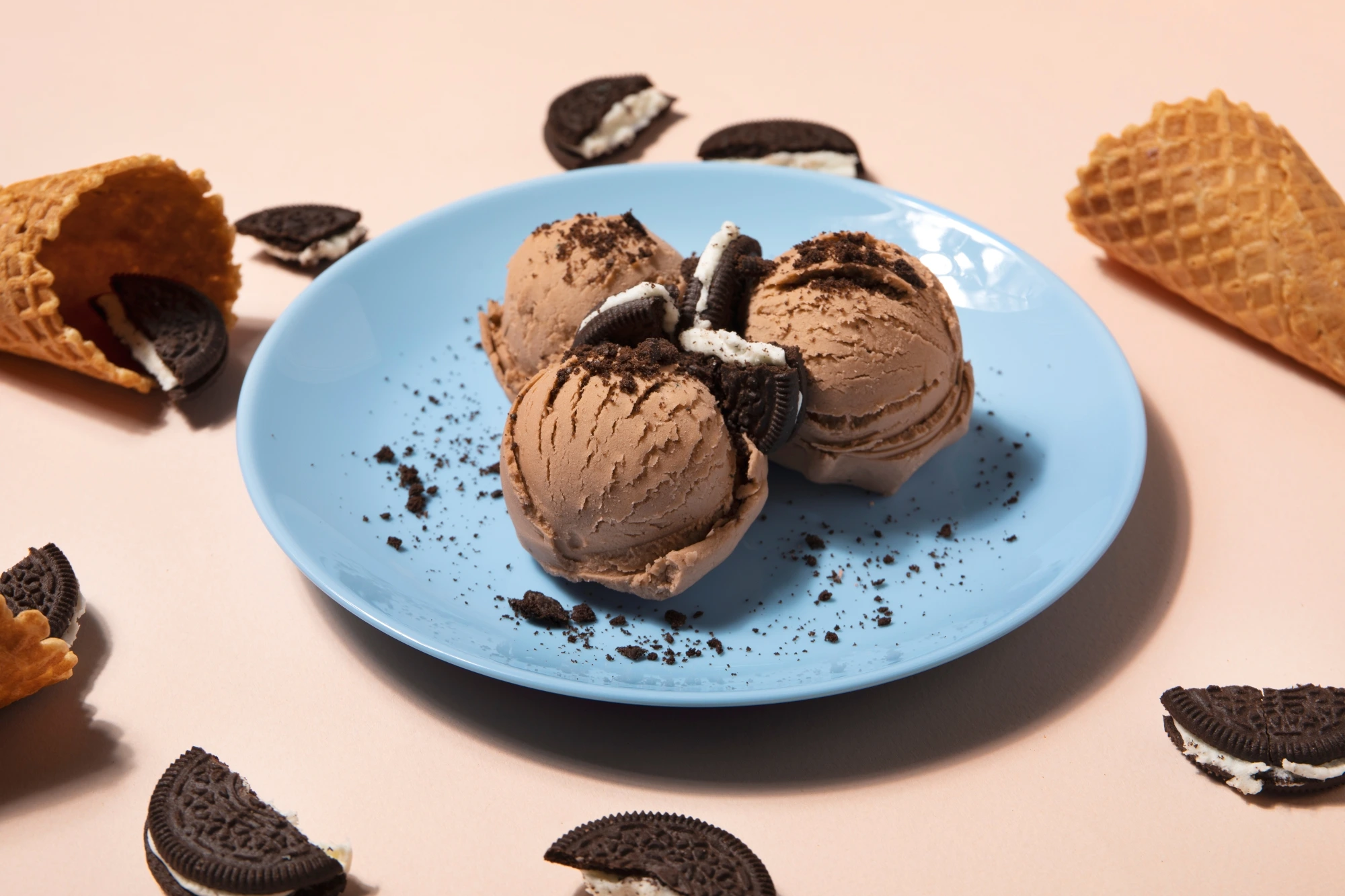 Es krim coklat dengan topping biskuit hancur atau wafer tipis adalah kombinasi yang sulit ditolak. Biskuit memberi tekstur renyah yang kontras dengan lembutnya es krim. Oreo crumbs, wafer stick, atau biskuit coklat klasik semuanya cocok banget dijadikan topping.